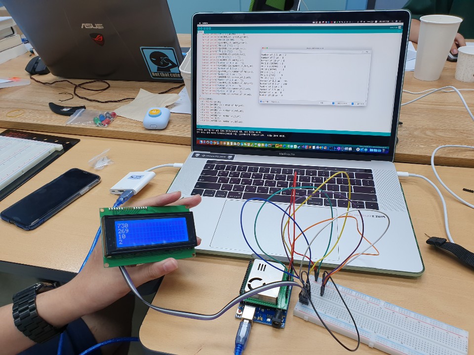 아두이노는 저걸 만들었다고 끝나는 게 아닌 이미 만든 아두이노 미세먼지 측정기 + 습도 측정기 등등 인식할 수 있고 전선을 꼽을 수 있는 한도 내에서, 그리고 여러 개를 버틸 수 있는 센 볼테이지가 충족된다면 여러 가지 기능을 다 구현할 수 있다.