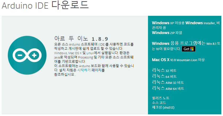 이 사이트에서 본인 PC에 맞는 아두이노 IDE 소프트웨어를 내려받는다.