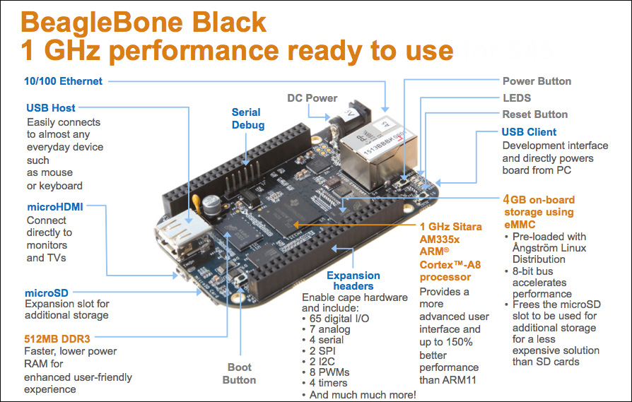 비글본블랙은 쉽게 말해 아두이노와 라즈베리파이의 중간쯤이라고 생각하면 쉽다.