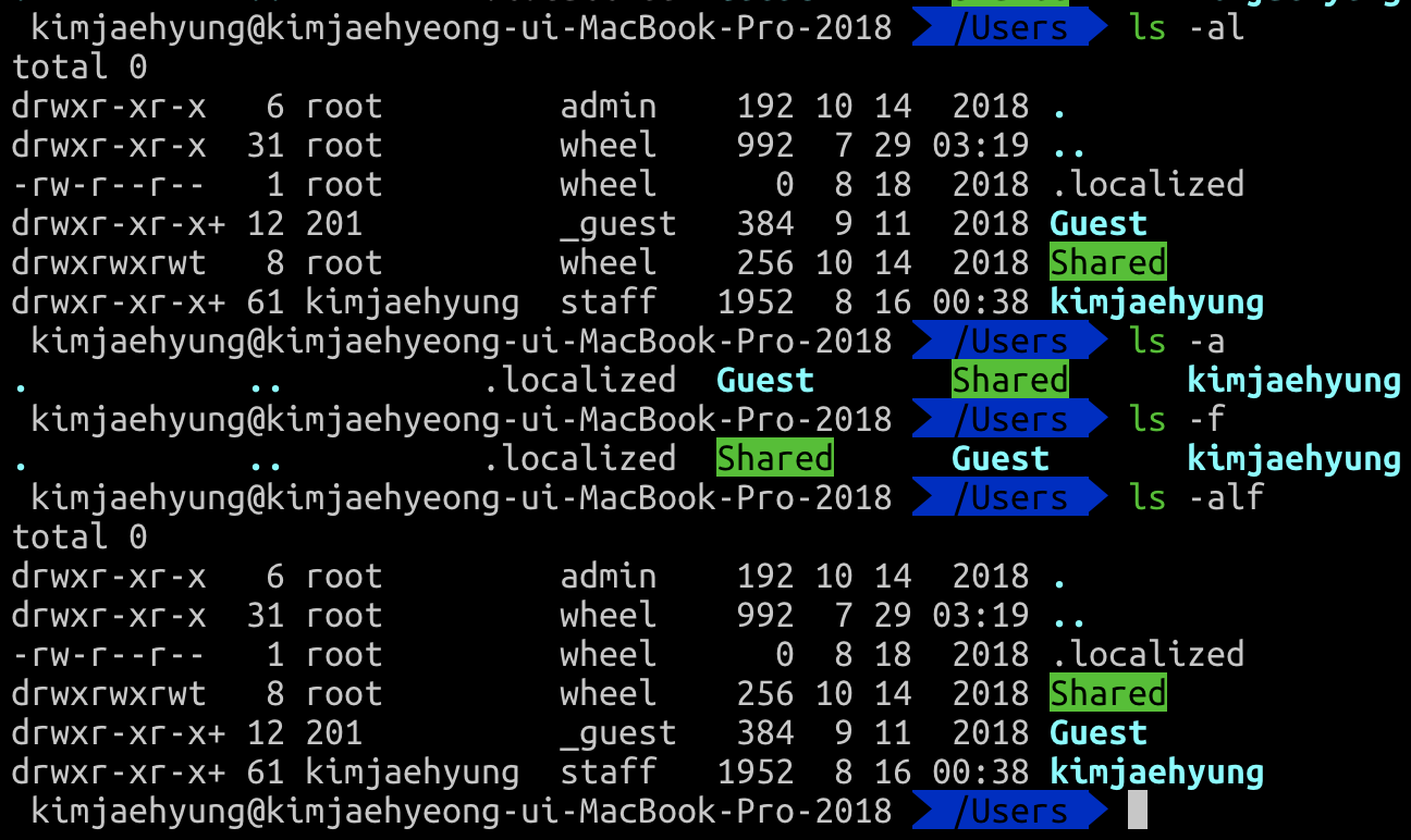 - -F : Display a slash(‘/’) for directory, an asterisk(‘*’) for executable file, at sign(‘@’) for symbolic link… etc.