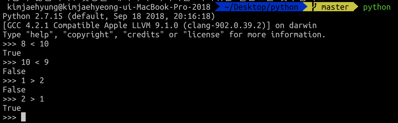 다음으론 10 < 9 라 입력하고 엔터 하였더니 False라고 나온다.