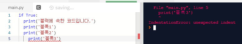 비정상의 경우 들여쓰기 오류가 나타난 것을 알 수 있다.