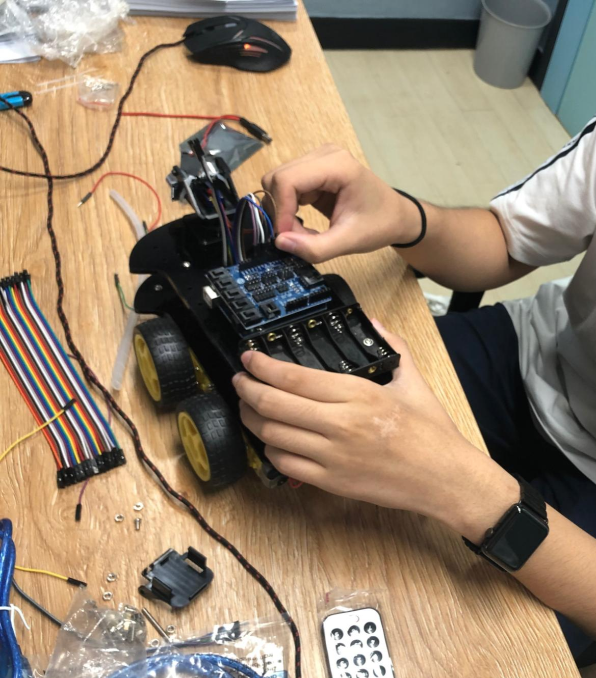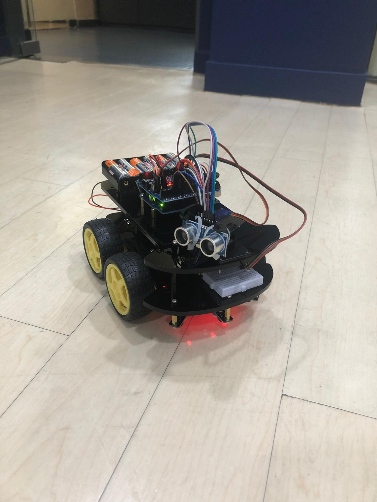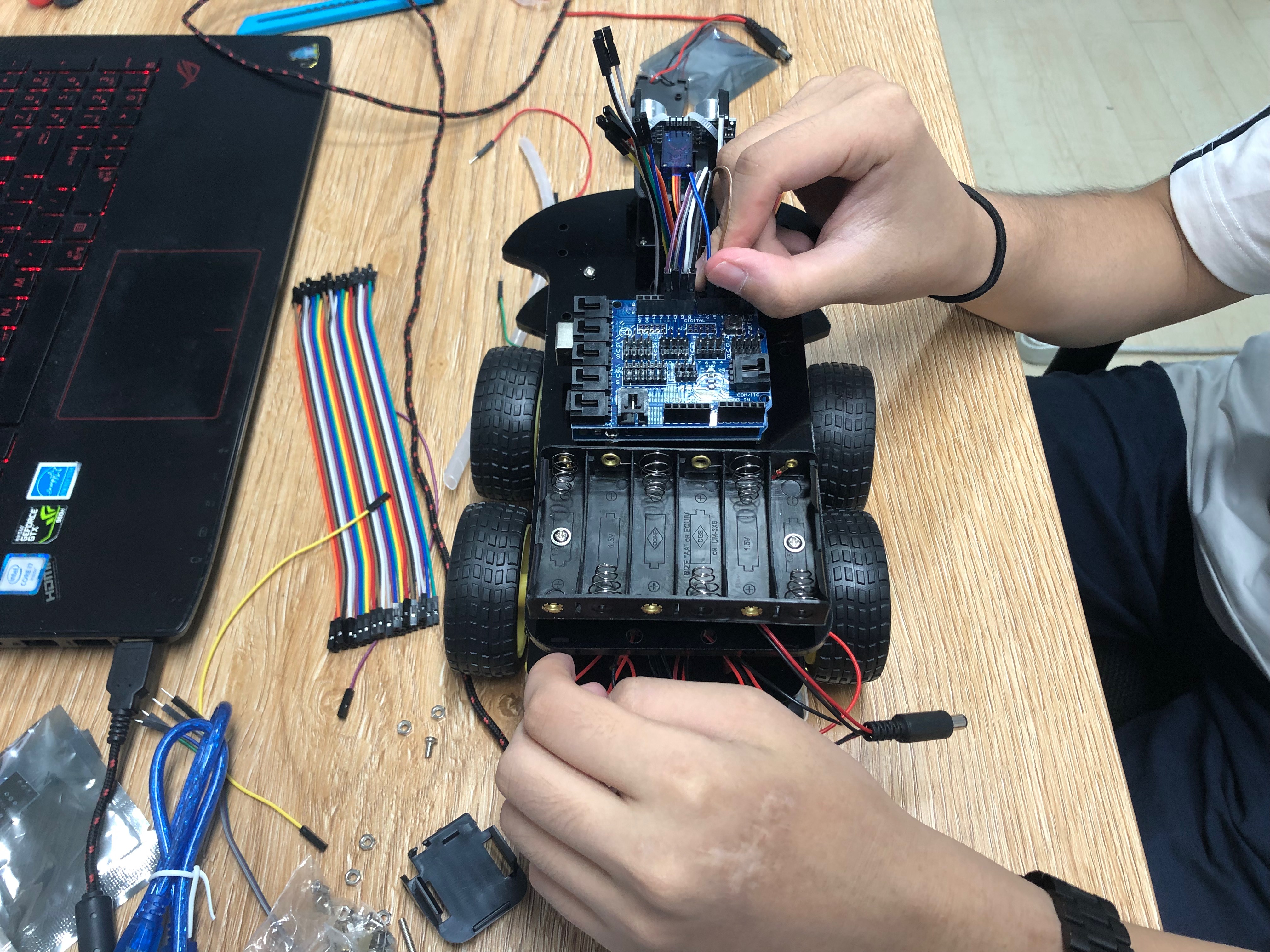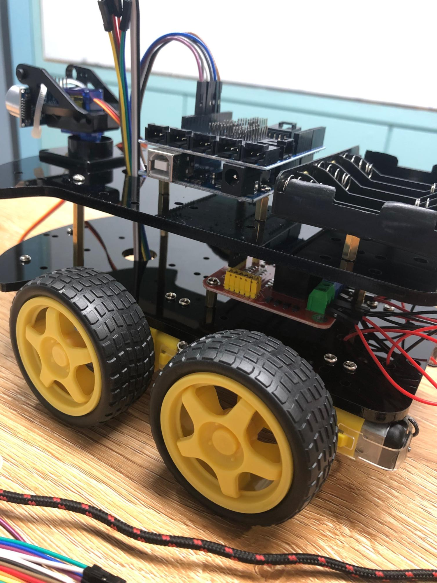 1층, 2층 구성이다. 바퀴를 굴릴 모터 4개와 그것을 조절하는 기판이 1층 그리고 아두이노와 확장 센서 등이 2층에 위치.