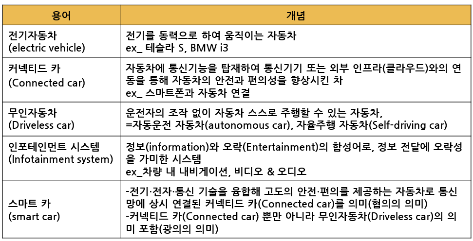 스마트카는 전기 전자 통신 기술(ICT)을 자동차 기술과 융합하여 커넥티드 카 및 무인자동차를 의미합니다.
