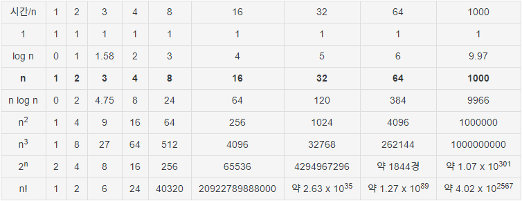 - 시간 복잡도(Time Complexity) : 알고리즘의 수행시간 분석결과