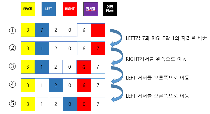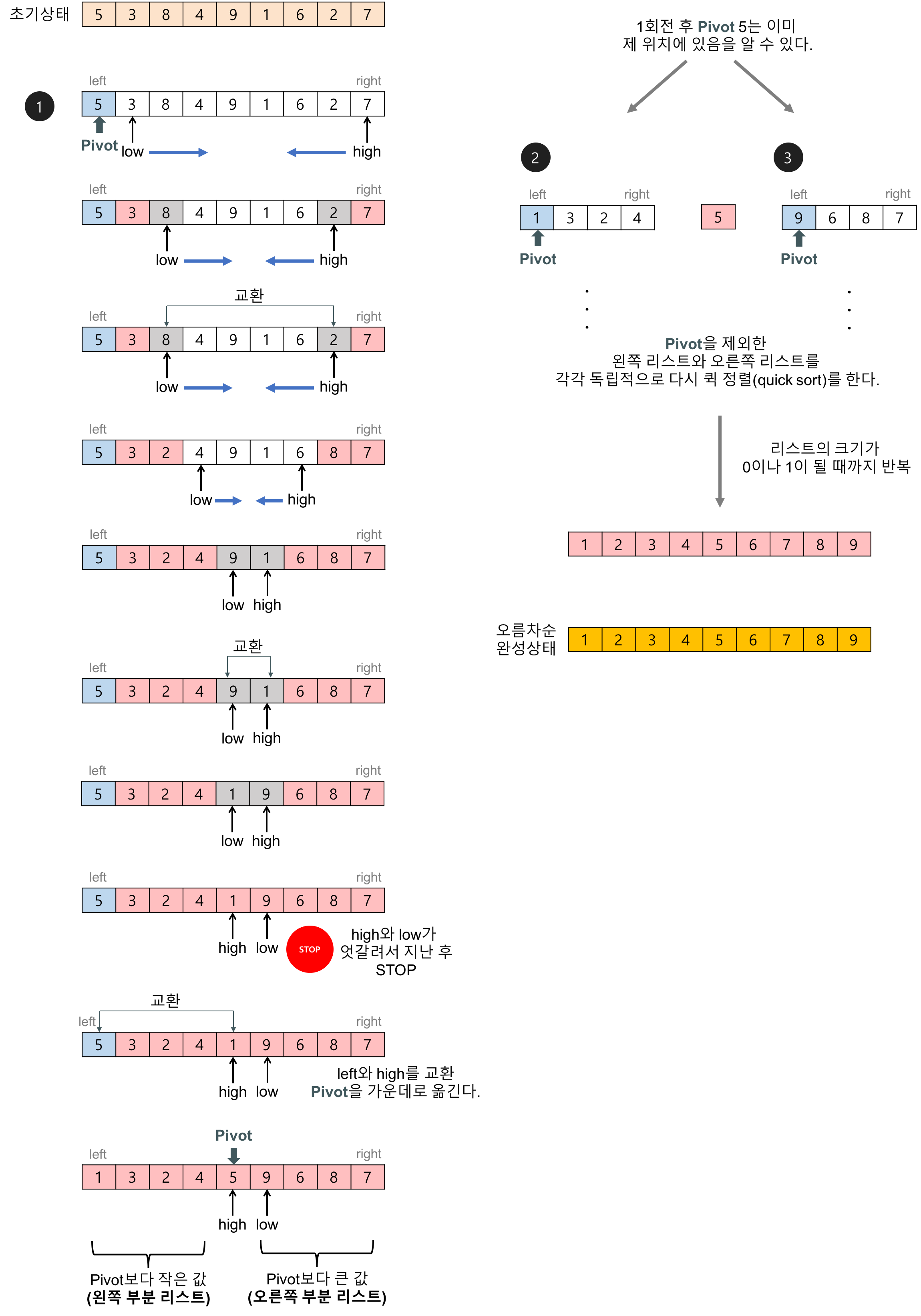 이 탐색-교환 과정은 low와 high가 엇갈릴 때까지 반복한다.