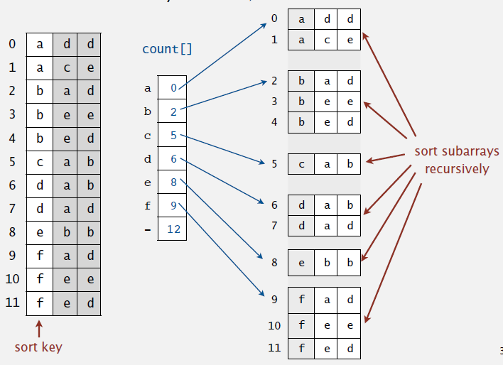 기수 정렬 알고리즘 중 LSD를 시각화한 것.