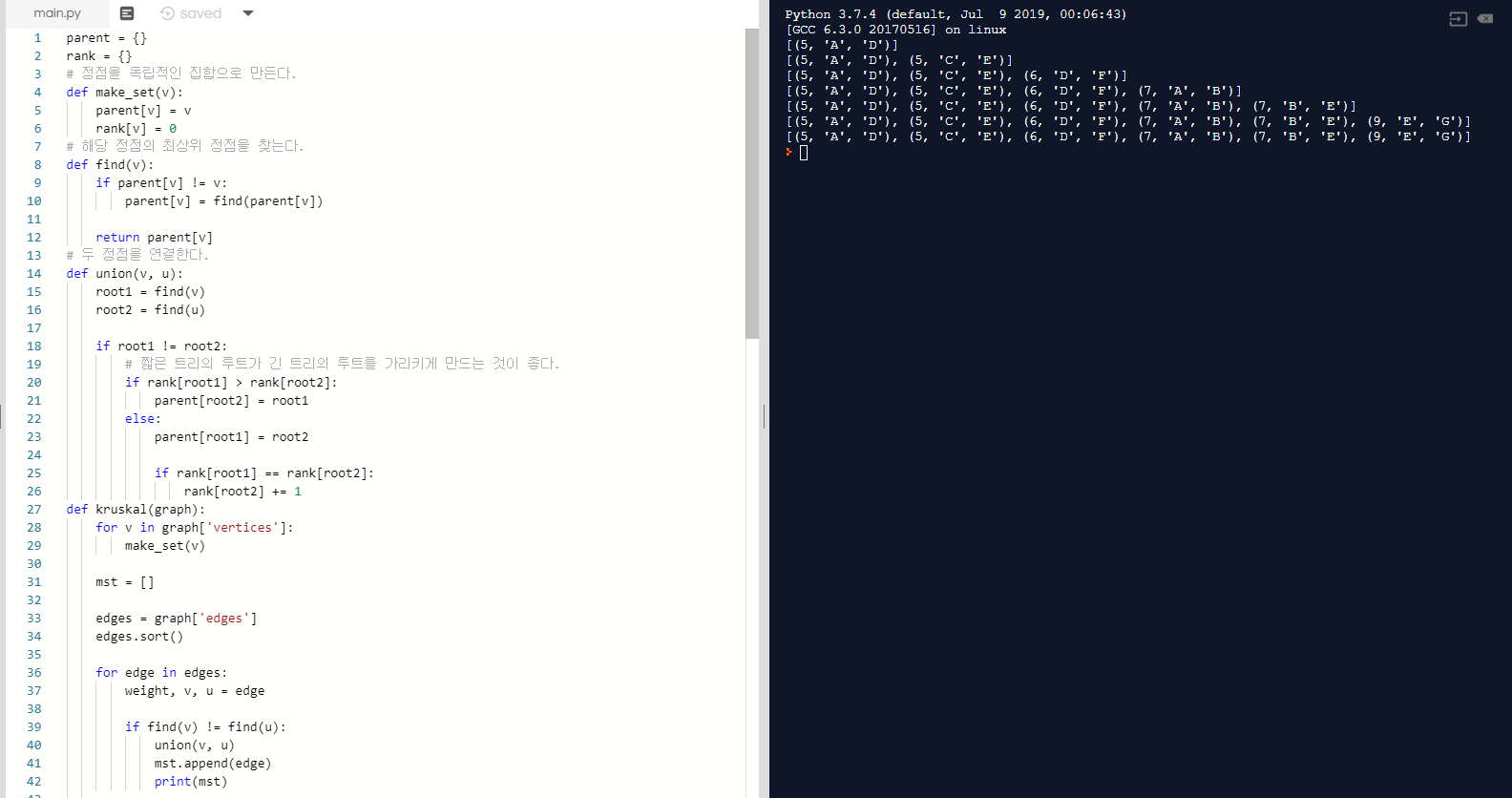 탐욕적인 방법(greedy method) 을 이용하여 네트워크(가중치를 간선에 할당한 그래프)의 모든 정점을 최소 비용으로 연결하는 최적 해답을 구하는 것