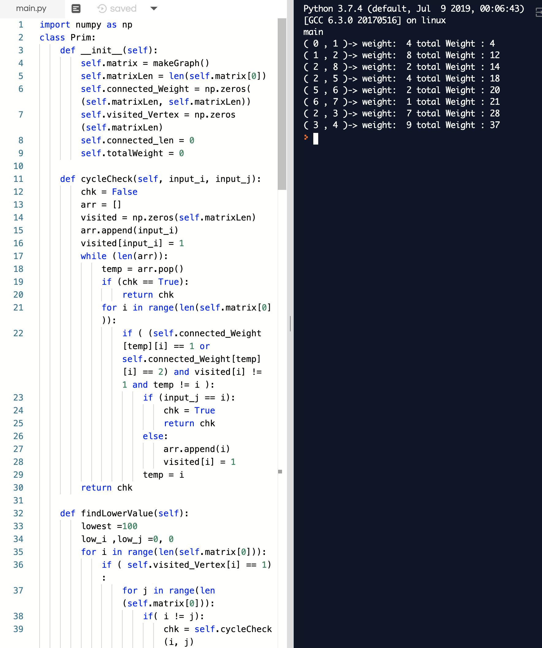 print("(", i, ",", j, ")-> weight: ", lowest, "total Weight :", self.totalWeight)