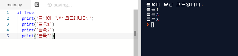 들여쓰기 된 상태에서 들어간 블럭은 원래 블럭 안에 포함 된 것이다.