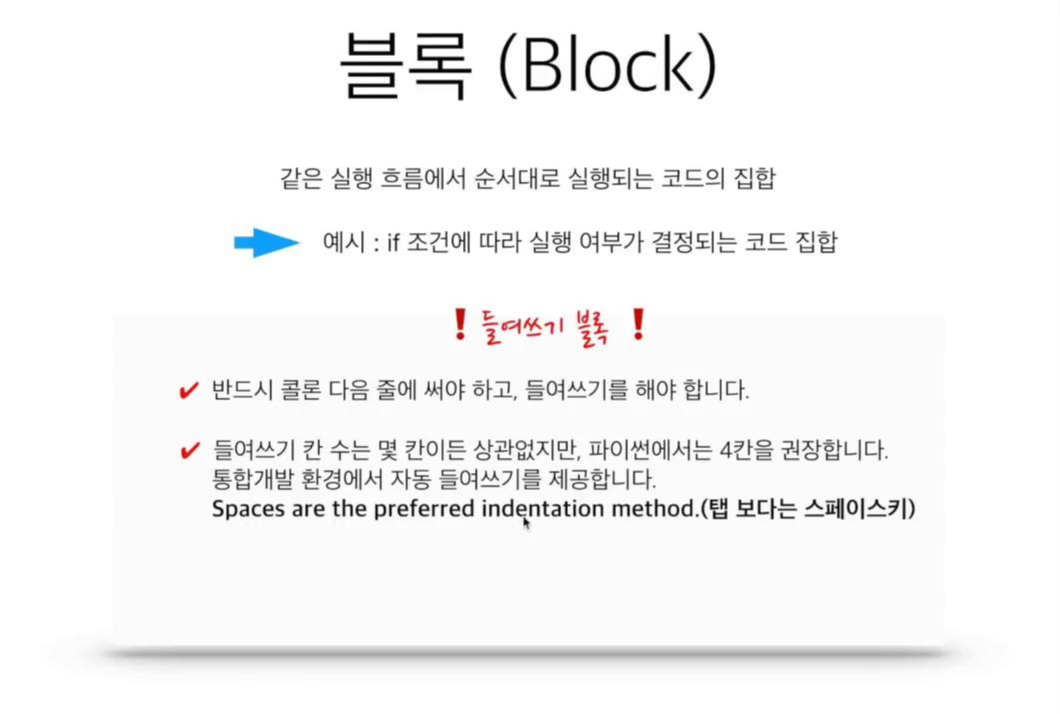파이썬 코드에서 ':' 다음에 들여쓴 코드는 블럭 이라고 부른다.