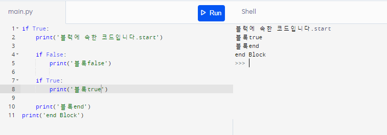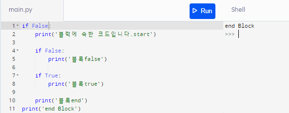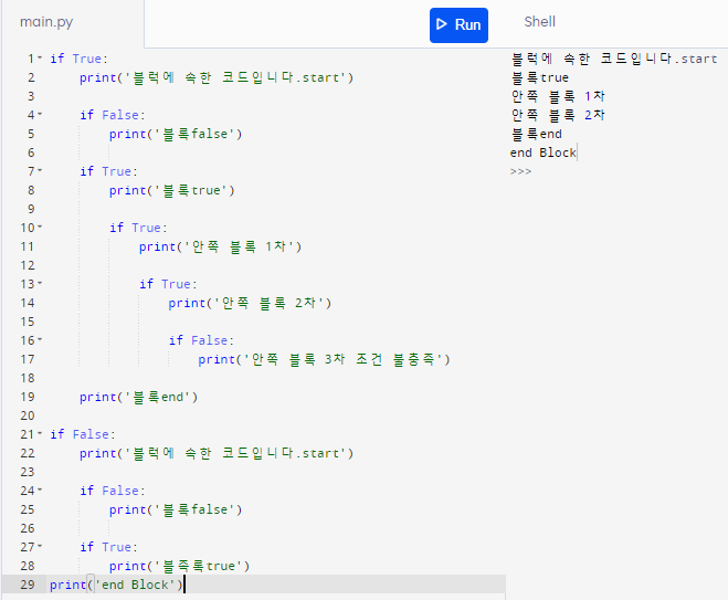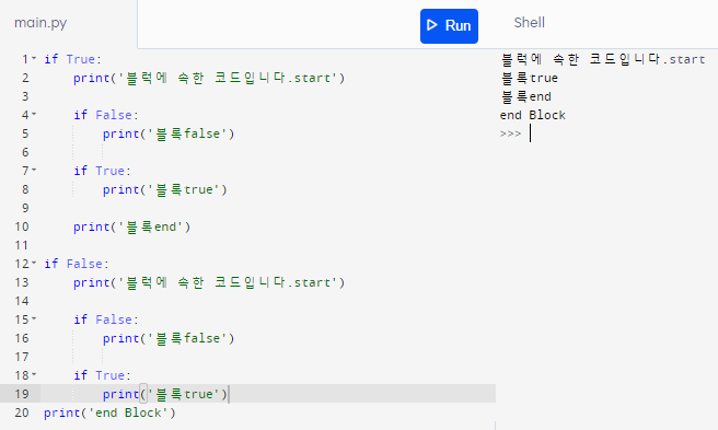 안쪽 if중 '블록False'는 실행이 안되고 뒤의 '블록True'는 실행되는 것을 확인할 수 있다.