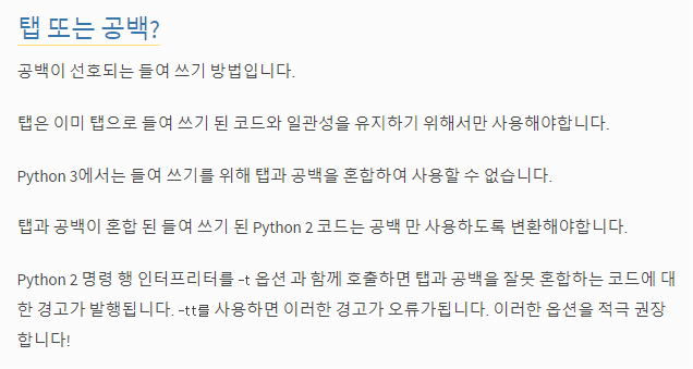 그러니까 들여쓰기를 할 때 처음에 탭 간격을 이용했으면 들여쓰기를 하는 부분 끝까지 탭을 이용해야하고, 처음에 스페이스 간격을 이용했으면 끝까지 스페이스 간격만 이용해야한다는 이야기다.